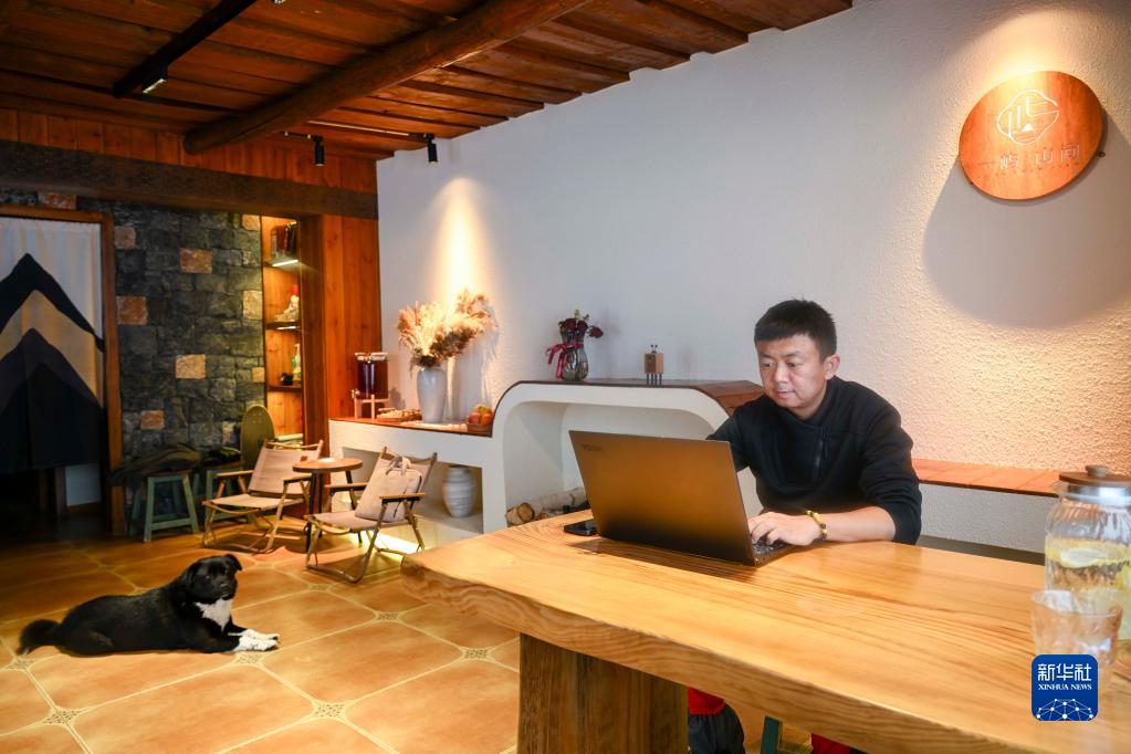 新疆阿勒泰地区禾木景区民宿经营户许亮在处理游客订单(1月7日摄),他的民宿春节期间已预订70%。许亮来自乌鲁木齐,看好旅游发展前景的他去年开始租用当地村民的小木屋开办民宿。