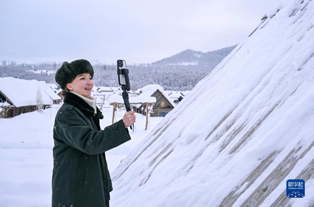 新疆阿勒泰地区禾木景区民宿经营户米娜通过网络直播介绍家乡雪景(1月7日摄)。她说,近年来,禾木吉克普林滑雪场冬季游客明显增多。