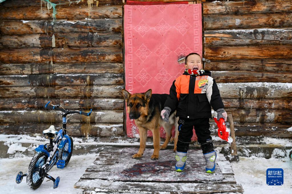 家住新疆阿勒泰地区禾木村的小朋友其力格尔在小木屋前玩耍(1月11日摄)。