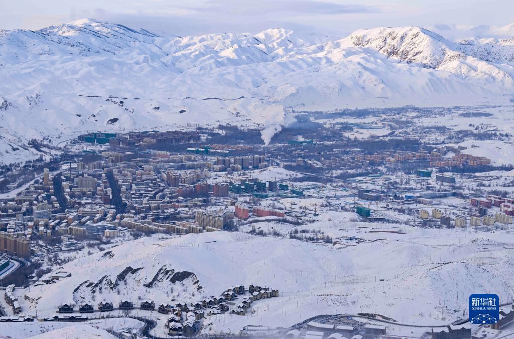 雪山脚下的新疆阿勒泰市城区(2022年12月30日摄)。
