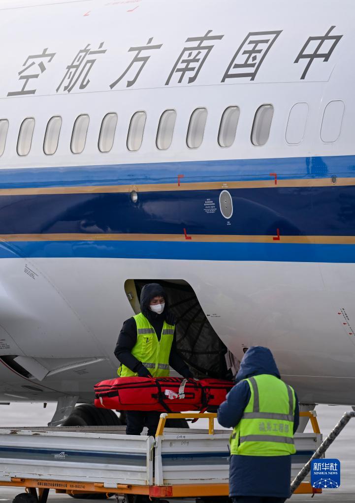 由广州直飞新疆阿勒泰市的航班降落后,阿勒泰机场工作人员在搬运乘客的滑雪板等行李(2022年12月30日摄)。该航班大部分乘客为雪友。为促进冬季旅游,阿勒泰联合广州、成都等地开通多条直飞“冰雪旅游航线”。