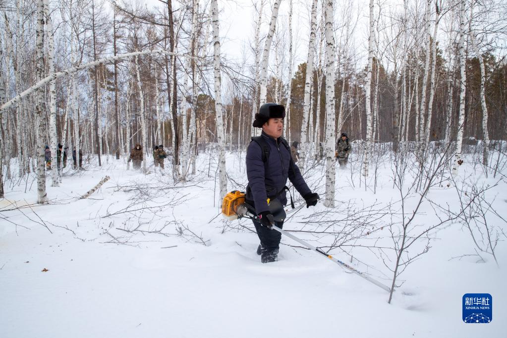 1月11日,在漠河林场管护区作业点,割灌机手齐勇刚在进行林间清理作业。