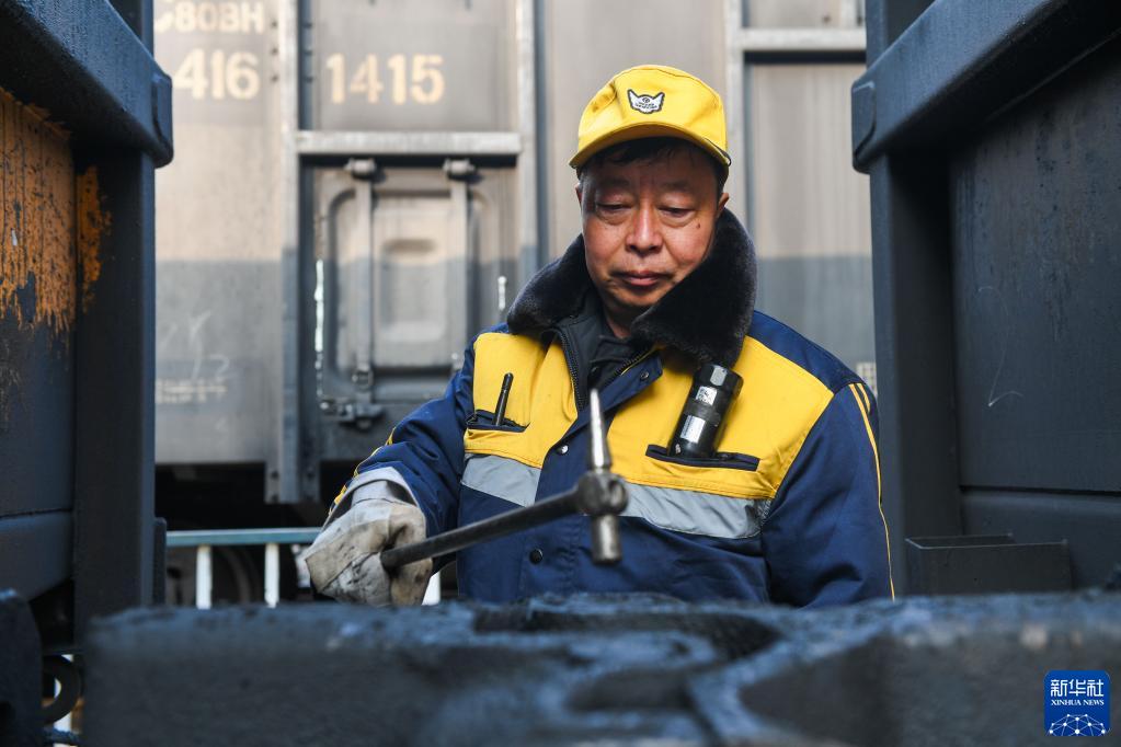 1月12日,吉海清在用检点锤为万吨大列进行敲击检查。新华社记者 刘磊 摄