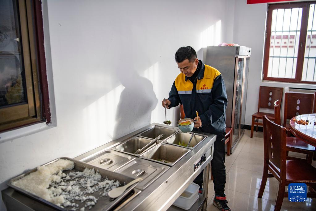 在拉林铁路扎囊工电综合工区,罗布在打饭(1月12日摄)。