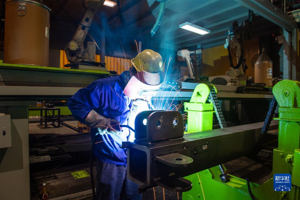 1月13日,在位于常德高新区的中联重科建筑起重机械有限责任公司生产车间,工作人员对产品零部件进行焊接生产作业。