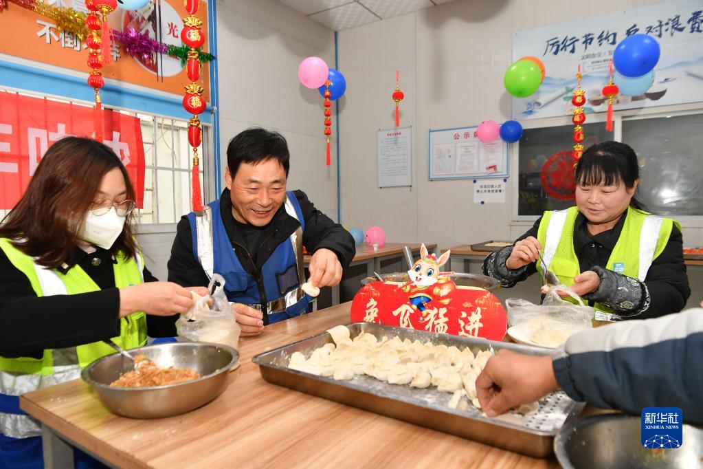 1月13日,在位于陕西省西安市的陕西师范大学体育训练中心建设项目现场,中建三局西北公司项目管理人员与工人一同包饺子。