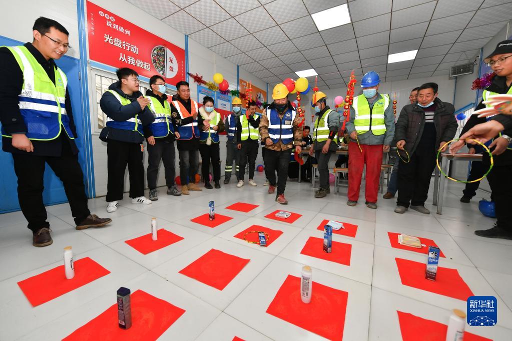 1月13日,在位于陕西省西安市的陕西师范大学体育训练中心建设项目现场,中建三局西北公司项目管理人员与工人进行游戏互动。