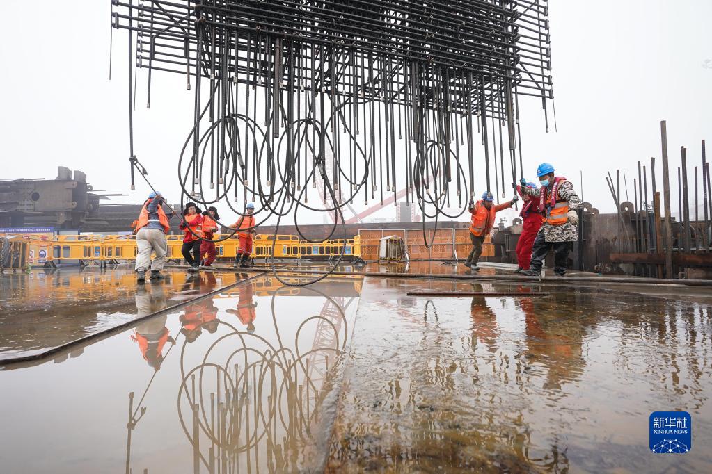 1月13日,工人在张靖皋长江大桥南航道桥南锚碇施工现场作业。