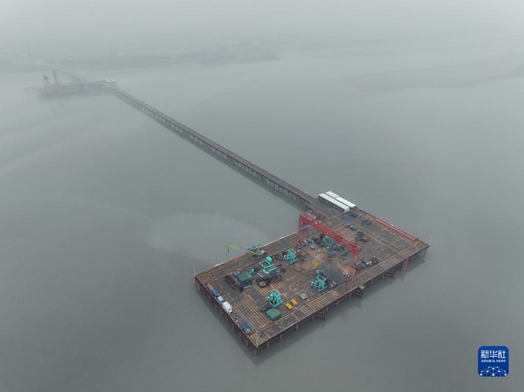 1月13日拍摄的张靖皋长江大桥南航道桥南主塔施工现场(无人机照片)。