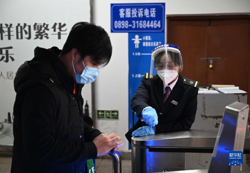 在广东徐闻的粤海铁路轮渡北港码头客运楼,肖玉凤(右)协助旅客刷票通过闸机(1月8日摄)。