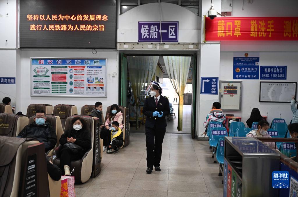 在广东徐闻的粤海铁路轮渡北港码头客运楼,肖玉凤(中)在候船大厅巡视(1月8日摄)。