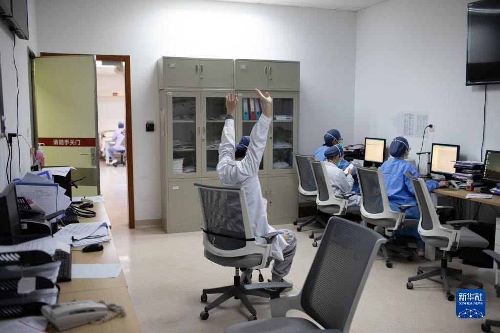 1月12日,在复旦大学附属华山医院虹桥院区急诊抢救室医生办公室,一名医生(左)在放松身体。