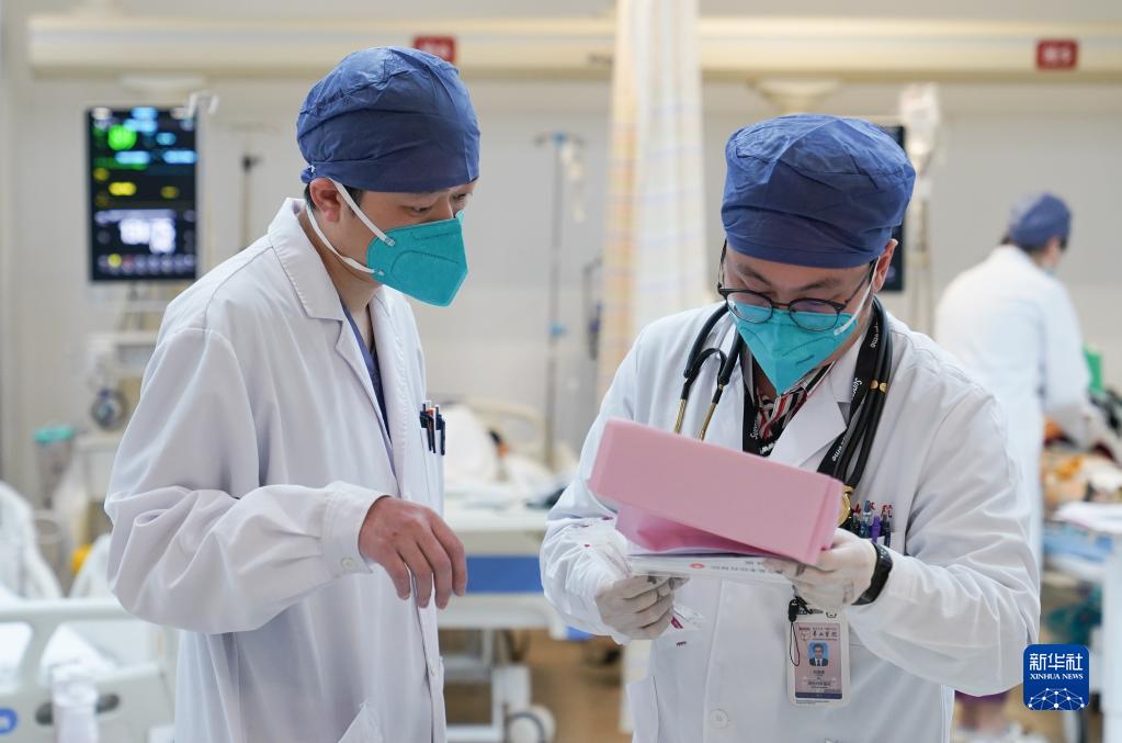1月7日,在复旦大学附属华山医院虹桥院区急诊抢救室,医生刘逸奇(右)和同事讨论患者病情。