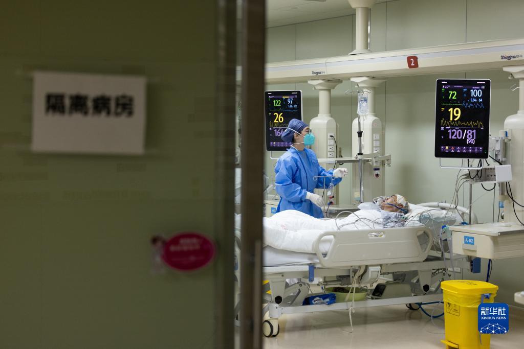 1月12日,在复旦大学附属华山医院虹桥院区收治肺炎患者的重症监护室,护士查看患者输液情况。