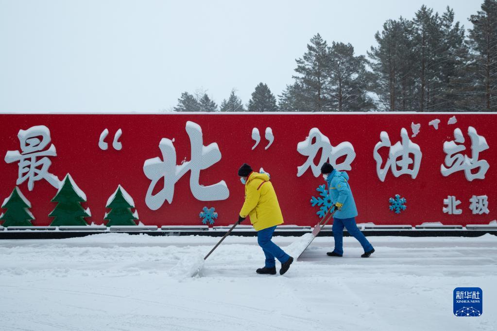1月12日,在北极村加油站内,工作人员沙德辉(左)和林德彬在清理积雪。