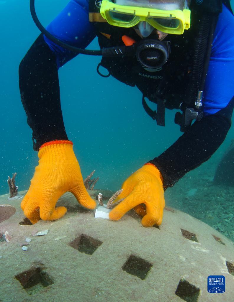 在海南省三亚市亚龙湾相关海域,潜水员在向人工生态珊瑚礁礁体上移植珊瑚(2022年11月16日摄)。