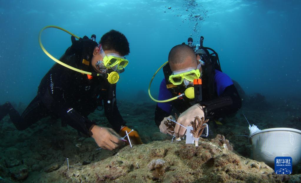 在海南省三亚市亚龙湾相关海域,潜水员在海底移植珊瑚(2022年11月17日摄)。