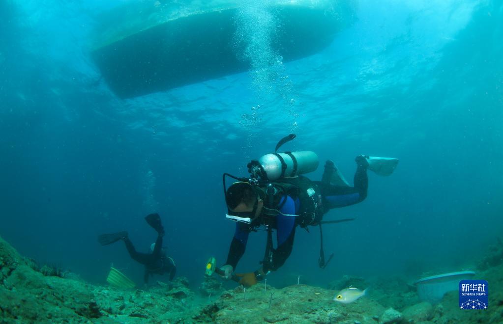 在海南省三亚市亚龙湾相关海域,潜水员在水下作业(2022年11月17日摄)。