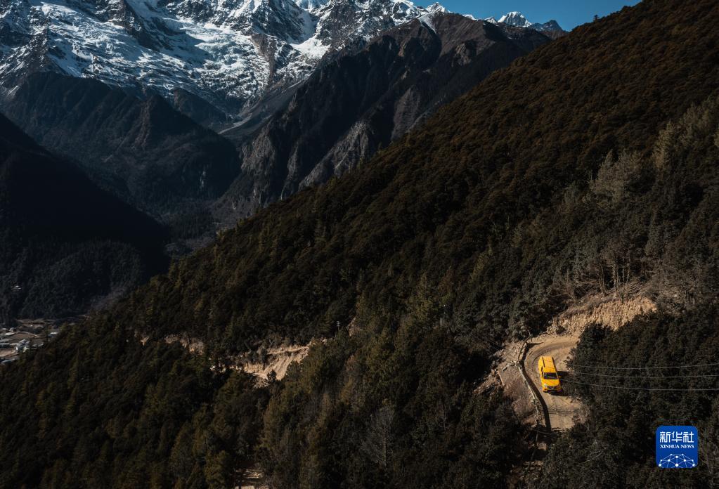 1月9日,旺登驾车驶入雨崩村检修电路(无人机照片)。