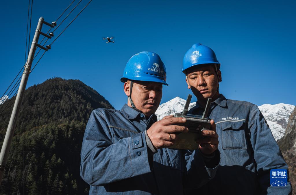 1月10日,旺登(右)与同事张金程开展无人机巡线作业。