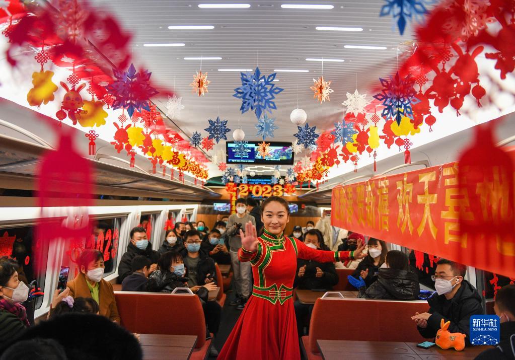 当日正值北方小年,北京开往呼和浩特的G2457次复兴号列车被乘务员们布置得喜气洋洋。高铁乘务员和铁路乌兰牧骑队员们,不仅为旅客奉上一台精彩演出,还准备了丰富的节日礼品,一路欢声笑语伴随着乘客。