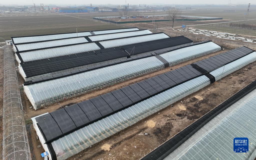 1月14日,唐山市丰润区燕沣园生态农场果蔬大棚的保温被根据气温变化进行调整(无人机照片)。