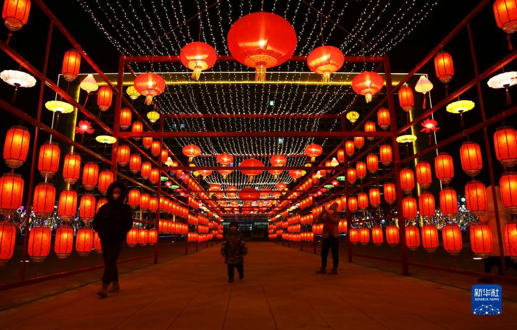 1月13日,市民在甘肃省定西市一处广场欣赏迎春灯饰。