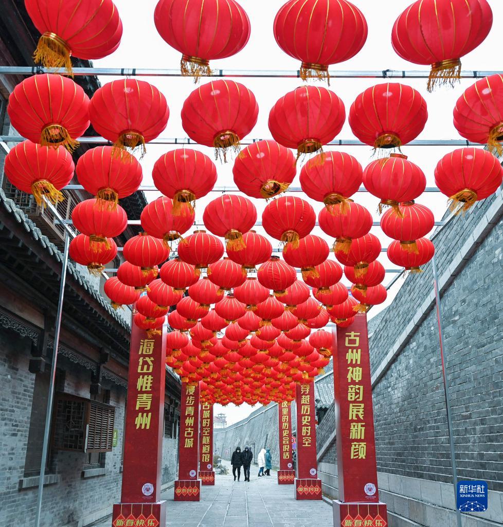 1月14日,游客在山东省青州古城景区赏灯游玩。
