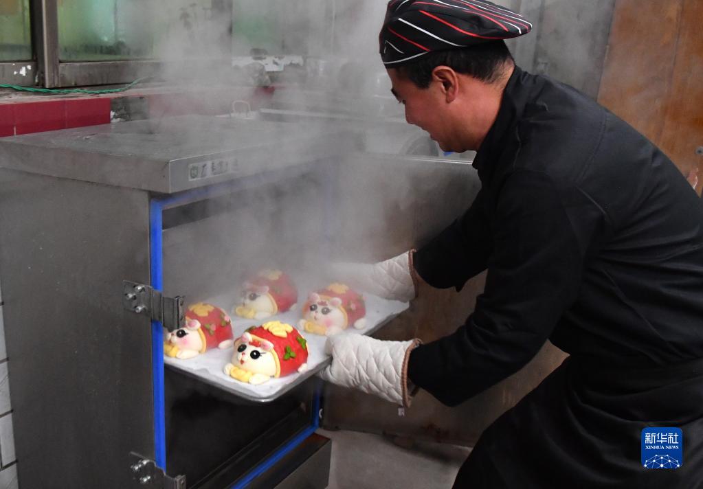 1月13日,面点师从蒸柜中端出兔型花馍。