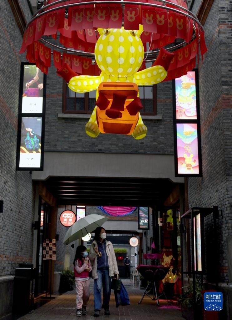 1月13日,人们漫步在“红包兔”彩灯装扮的弄堂中。