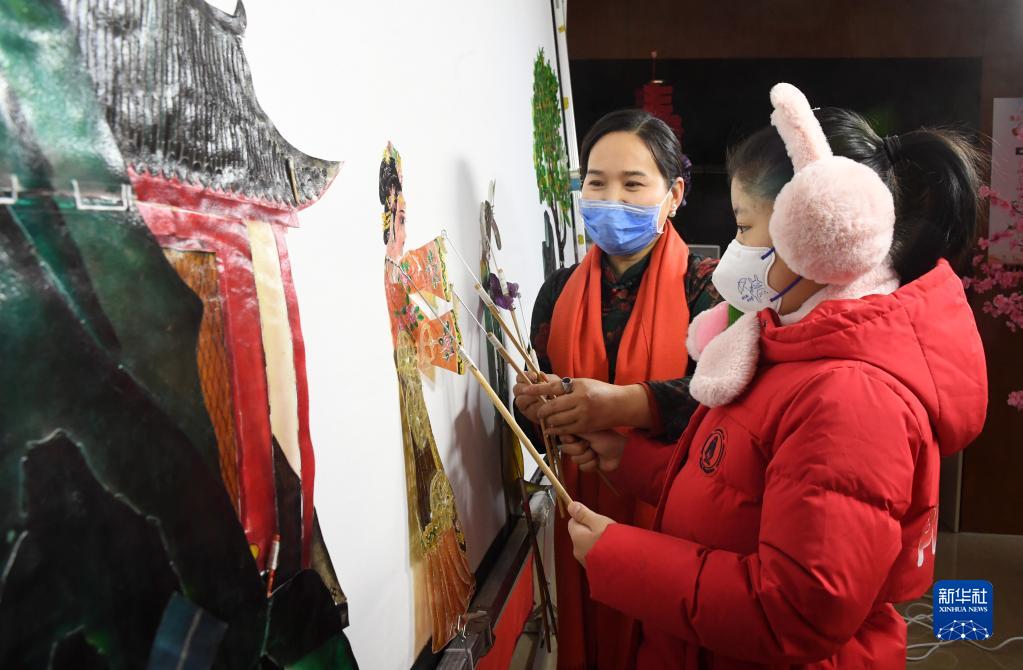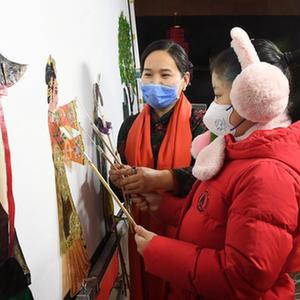 1月14日,在海淀北部文化中心,小朋友在体验皮影戏表演。