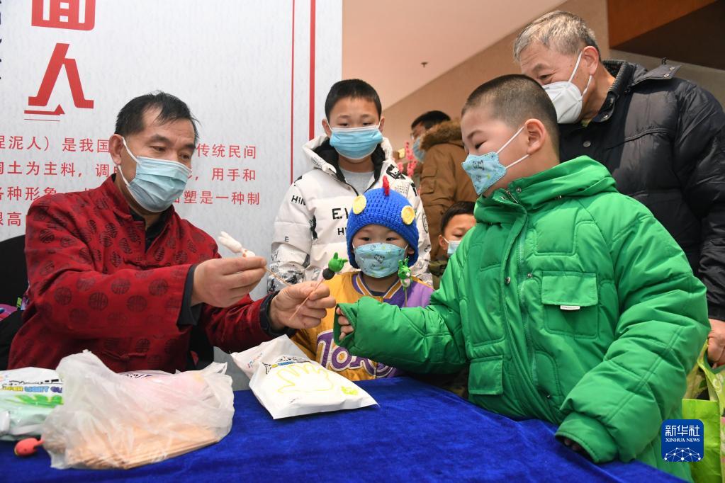 1月14日,在海淀北部文化中心,小朋友在观看“捏面人”。