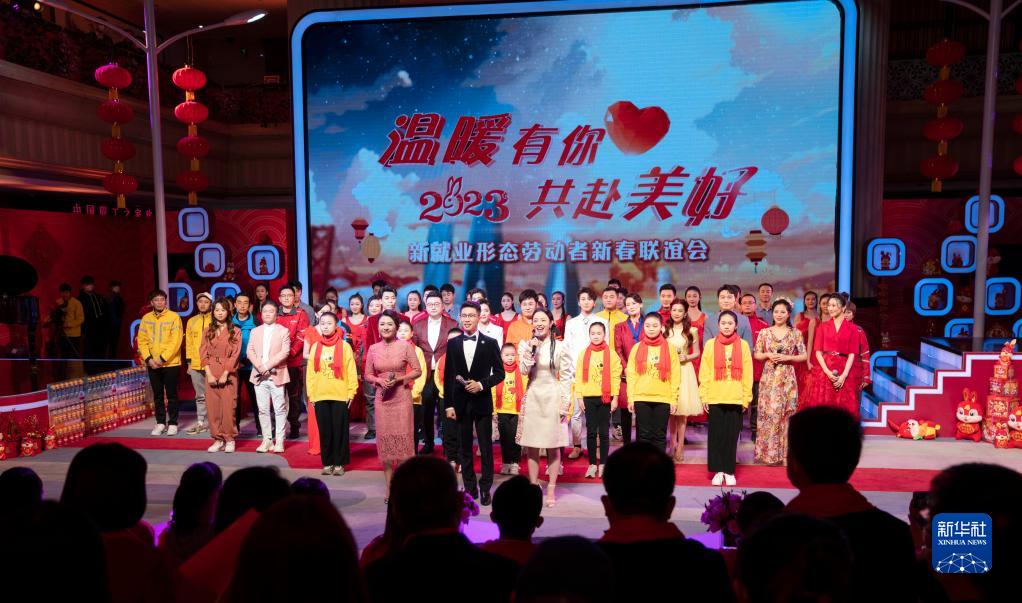 当日,由中华全国总工会文工团与中国财贸轻纺烟草工会联合主办的“温暖有你 共赴美好”新就业形态劳动者新春联谊会在北京举办。联谊会通过歌曲、舞蹈、相声、诗朗诵、钢琴演奏等艺术形式,突出喜庆、温暖、美好的主基调。部分节目还邀请新就业形态劳动者与演职人员同台表演,为广大新就业形态劳动者送去新春祝福。