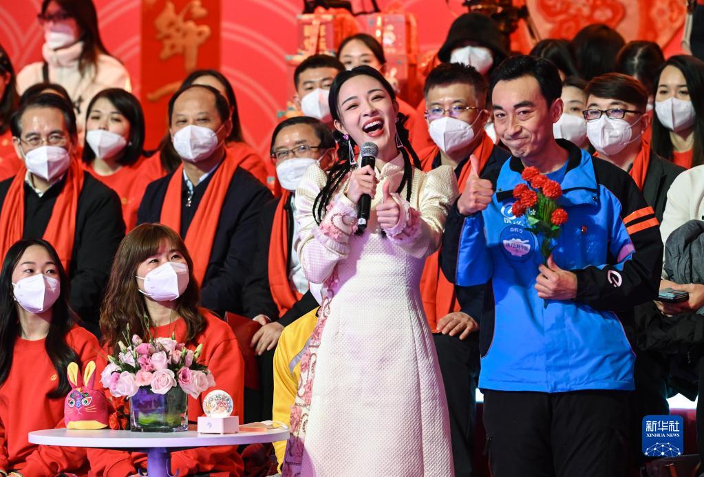 1月13日,抗疫保供党员代表、“饿了么蓝骑士”李雪贞(前排右一)受邀在新春联谊会现场为观众送上祝福。