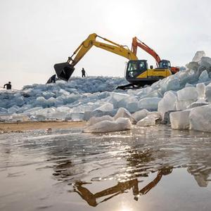 时值三九,河北省唐山市丰南区黑沿子渔港附近的农民忙着切割冰封的河面获取冰块、储存。据了解,每年寒冬时节,河北省唐山、秦皇岛等沿海地区的农民都会在冰封的河面上切割冰块、储存,用于水产、蔬菜保鲜等行业。