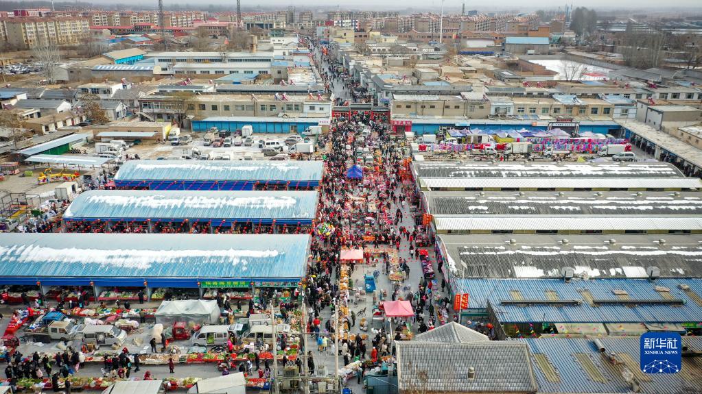 1月14日,人们在贺兰县金贵大集上选购年货(无人机照片)。