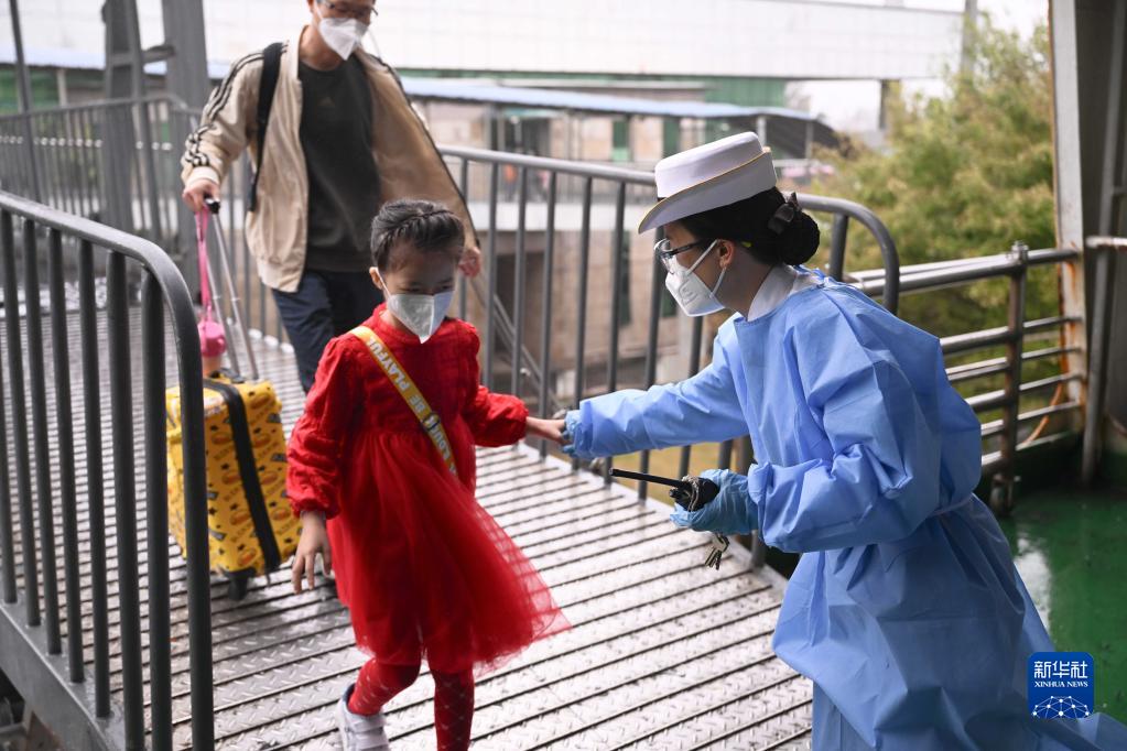 肖遥(右)帮助登上粤海铁路轮渡的小朋友走下栈桥(1月8日摄)。