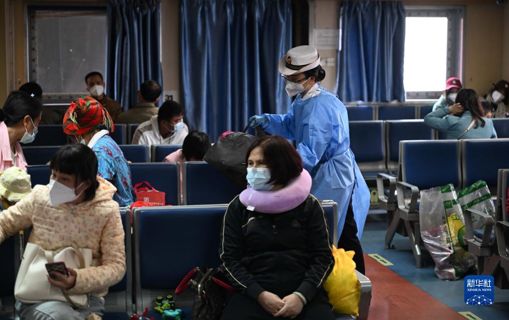 肖遥(后中)帮助粤海铁路轮渡上的旅客摆放行李(1月8日摄)。