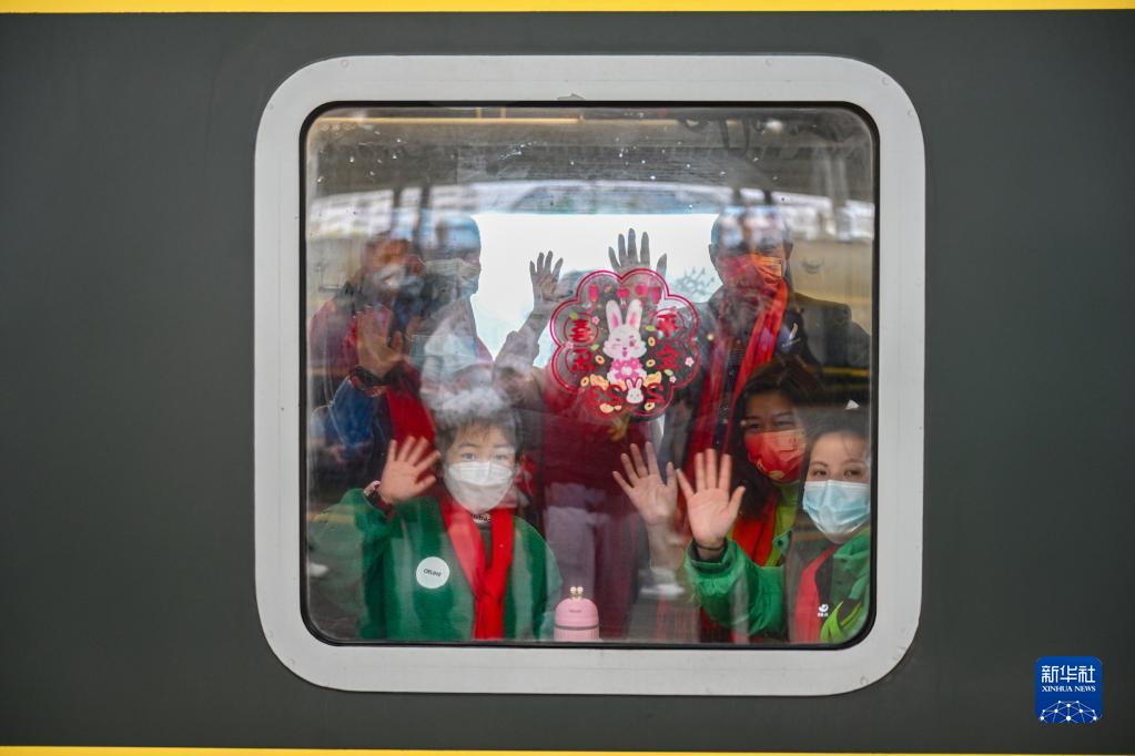 1月13日,在福州火车站,务工人员及家属隔着车窗向火车站服务人员挥手致谢。