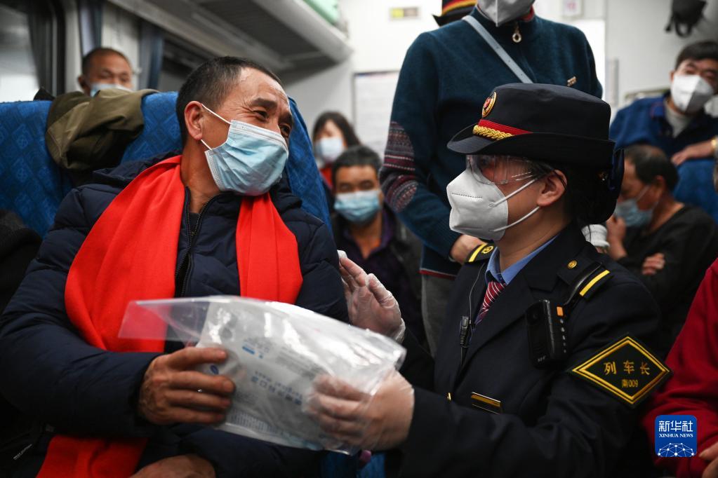 1月13日,乘务员在K1268次列车车厢里为乘客发放防疫健康包。