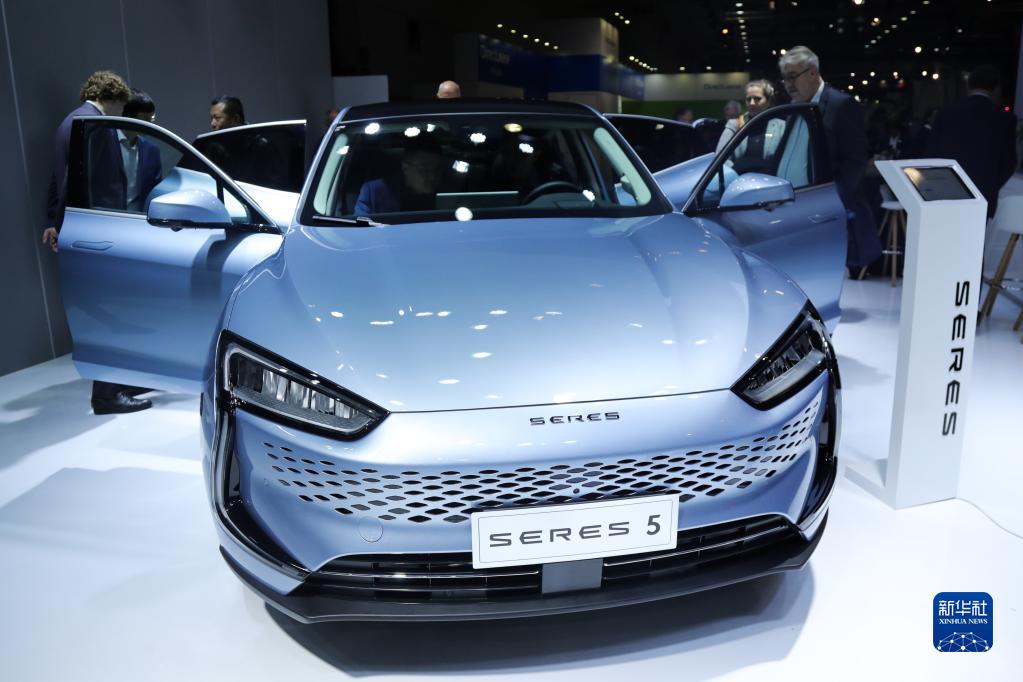 1月13日,人们在比利时布鲁塞尔车展媒体开放日上参观赛力斯5电动汽车。