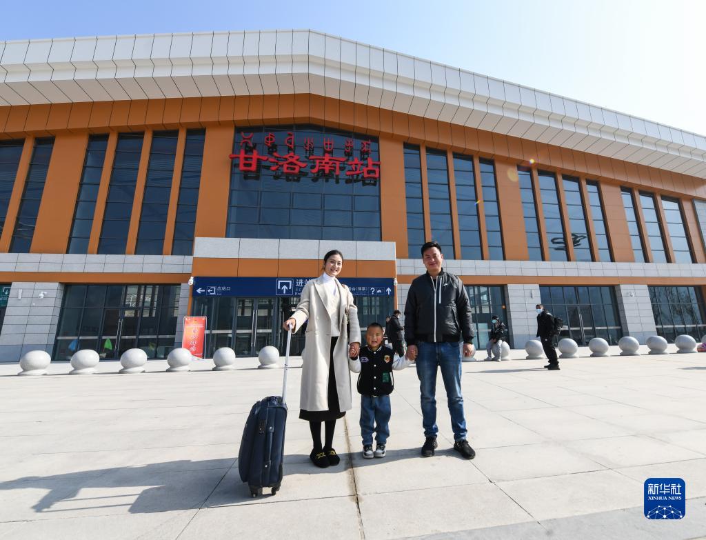 1月12日,在甘洛南站,退乘回家的阿依布卡(左)、丈夫阿木古乃(右)和儿子邱煜扬在站前广场合影。新成昆铁路的全线贯通运营,也极大缩短了她回家的时间。