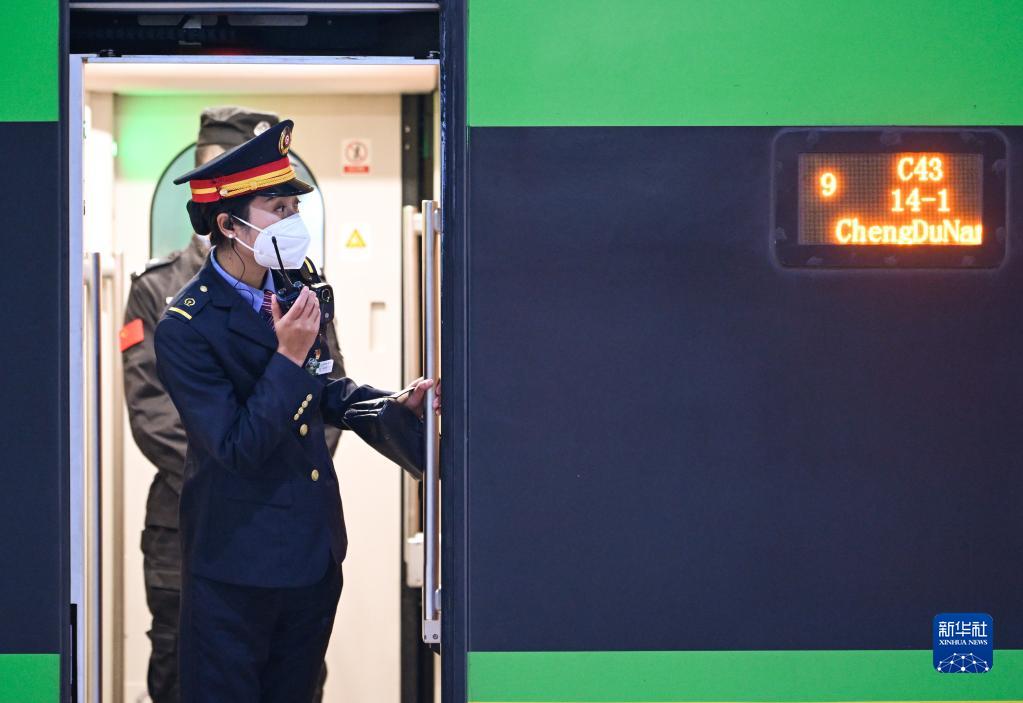 1月11日,在成都火车南站,阿依布卡(前)呼叫司机关闭车门。