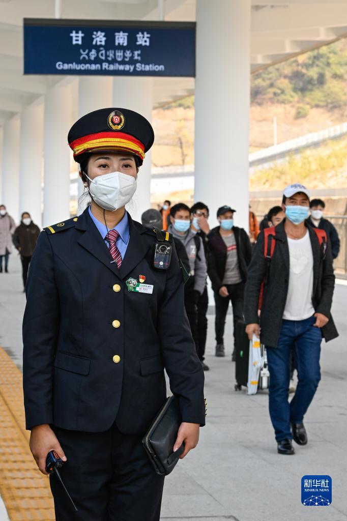 1月11日,在甘洛南站,阿依布卡在站台上迎接旅客上车。