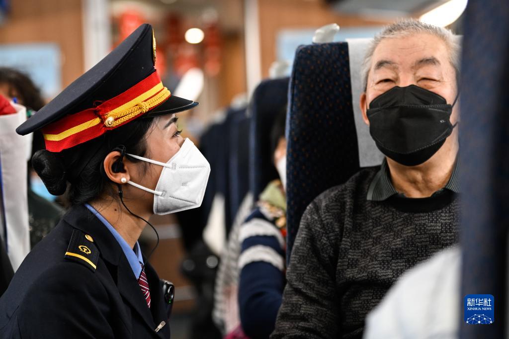 1月11日,在C43次列车上,阿依布卡(左)和一位旅客交流。