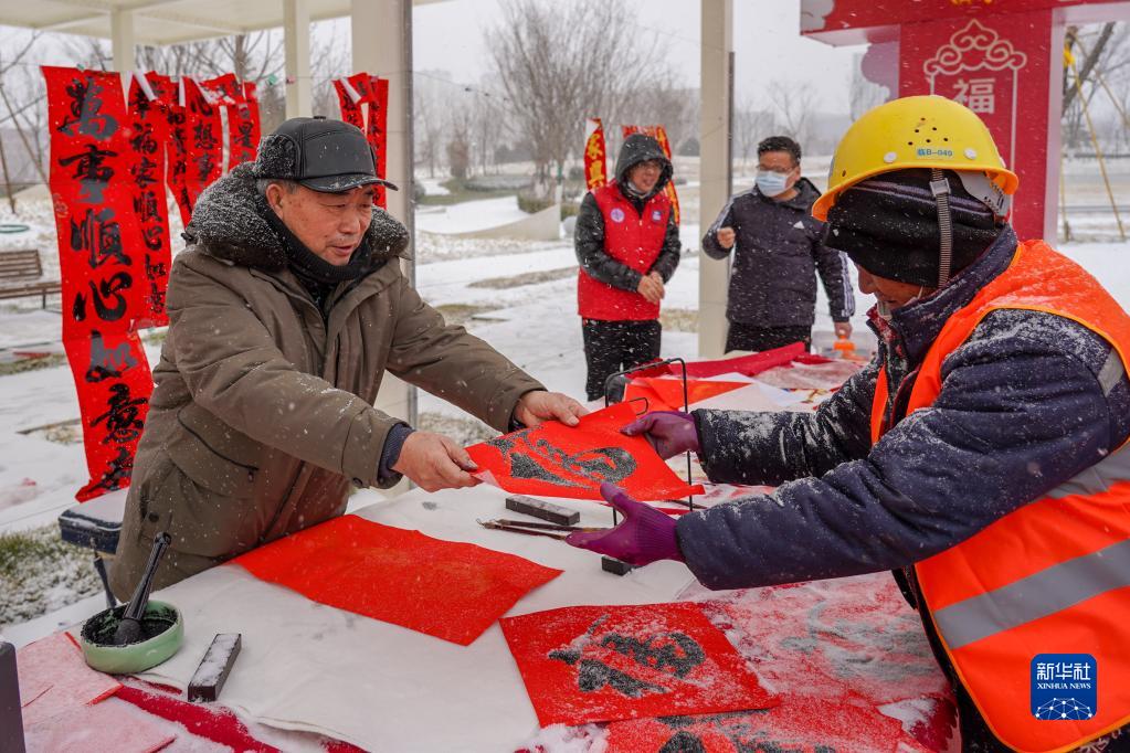 1月14日,书法爱好者在现场书写春联、福字,赠送给工友。