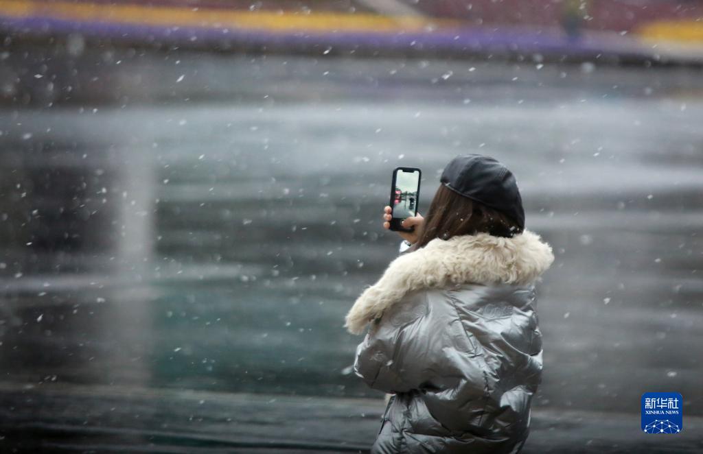 1月14日,市民在江苏省扬州市街头赏雪拍照。