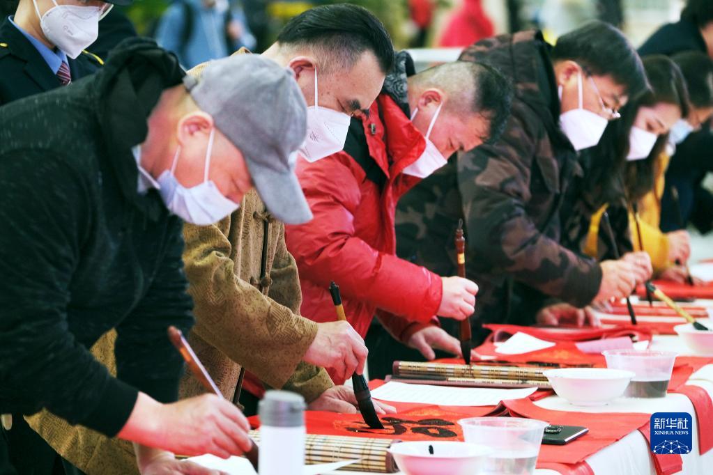 当日正值北方小年,一场“送万福、进万家”书法公益活动在天津站候车大厅举行。多名书法家现场书写福字和春联,由车站工作人员送给旅客,送上浓浓的祝福。新华社发(杨宝森 摄)