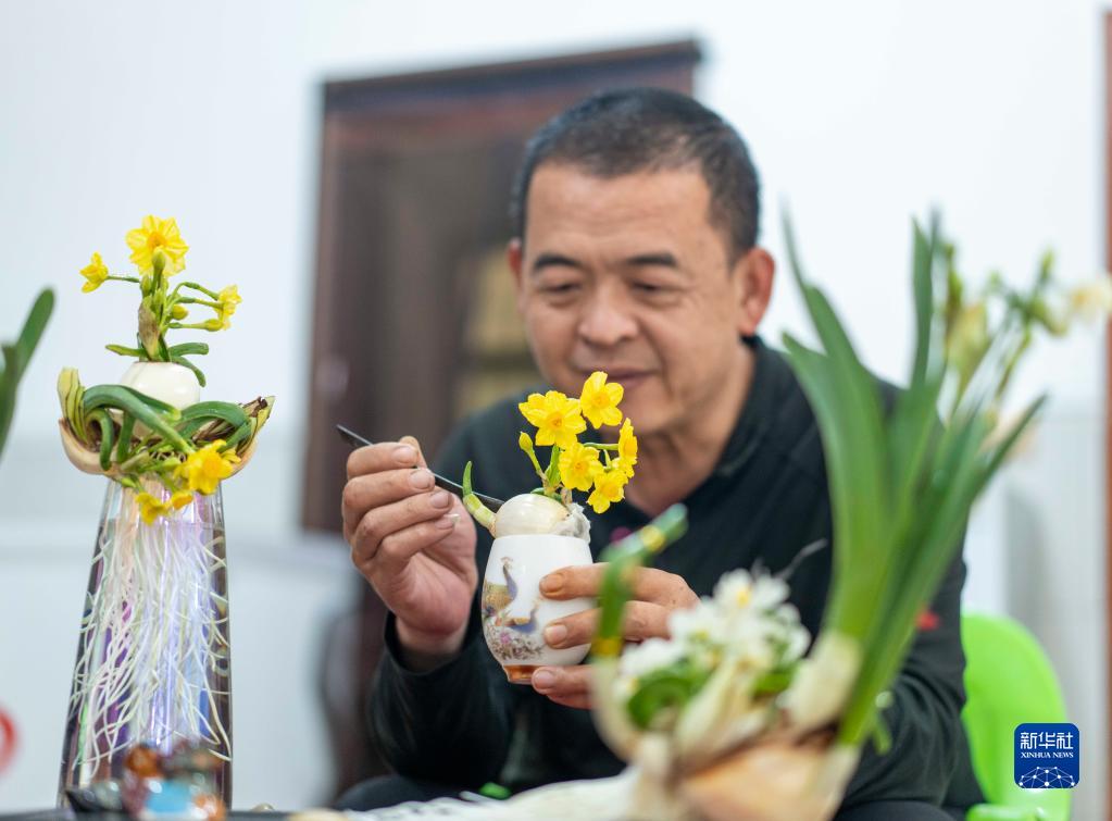多年来,福建漳州花农探索出种球阉割、三年复种的水仙种植技术,收获鳞茎硕大、花苞较多的花球。一颗饱满的水仙花球要通过雕刻师开盖、疏隙、削叶等雕刻步骤初步成形,经过一个月左右的养护,再加以创意雕琢,塑造出各式各样的水仙花雕艺盆景,为新春佳节增添一抹诗情画意。新华社发(张旭 摄)