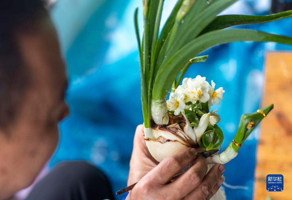 多年来,福建漳州花农探索出种球阉割、三年复种的水仙种植技术,收获鳞茎硕大、花苞较多的花球。一颗饱满的水仙花球要通过雕刻师开盖、疏隙、削叶等雕刻步骤初步成形,经过一个月左右的养护,再加以创意雕琢,塑造出各式各样的水仙花雕艺盆景,为新春佳节增添一抹诗情画意。新华社发(张旭 摄)